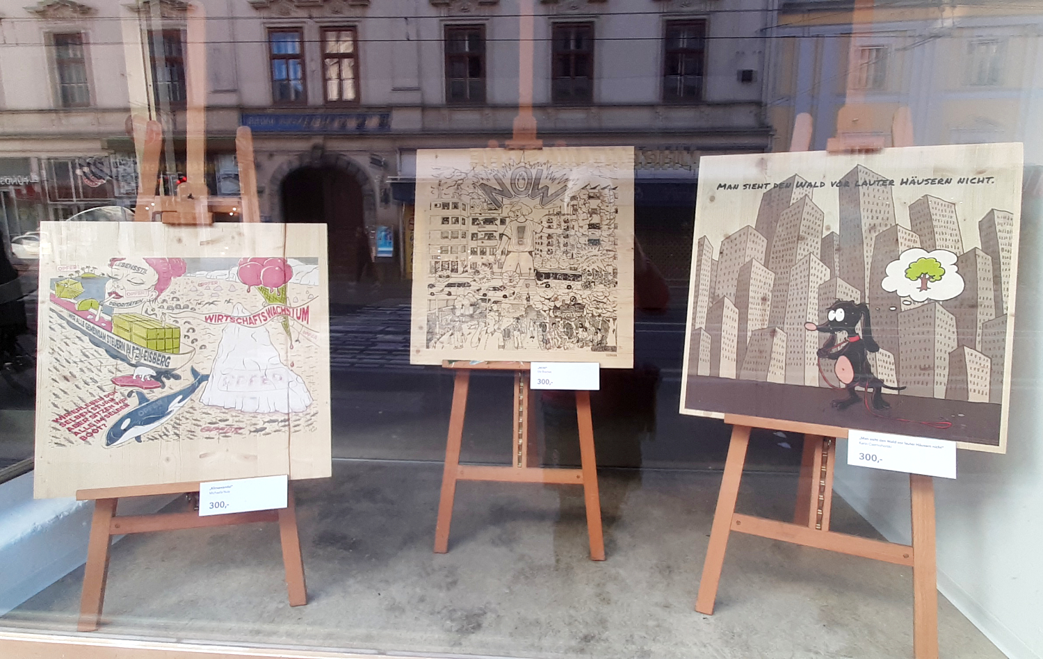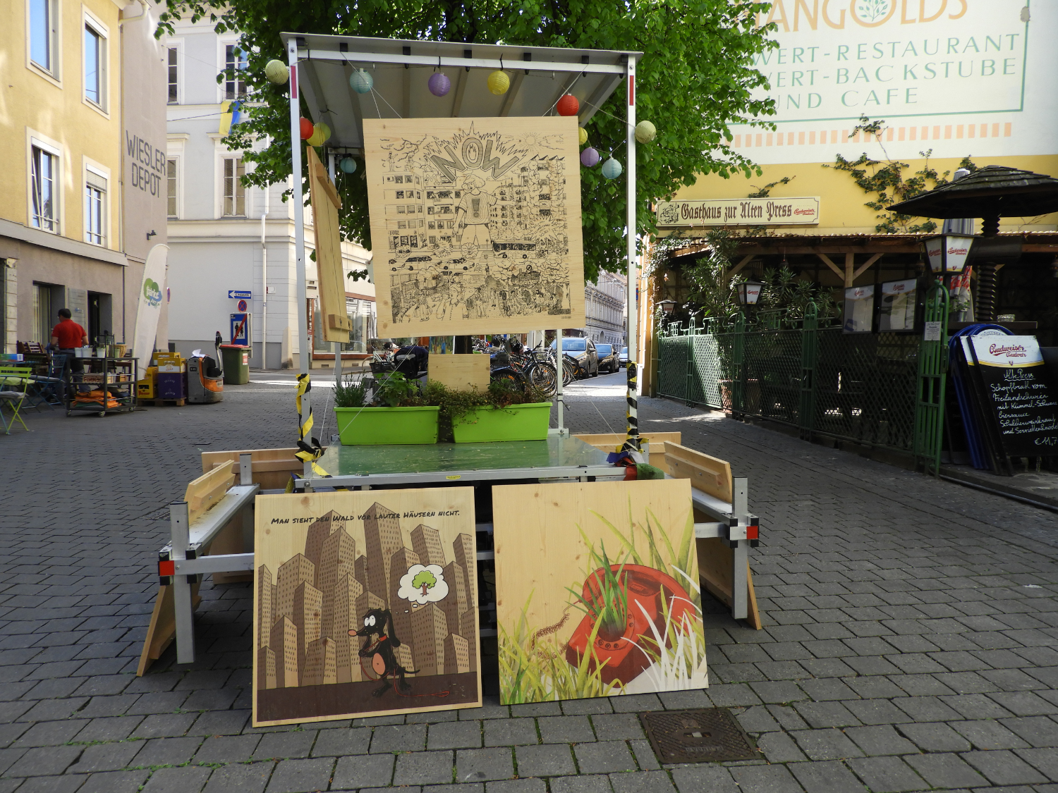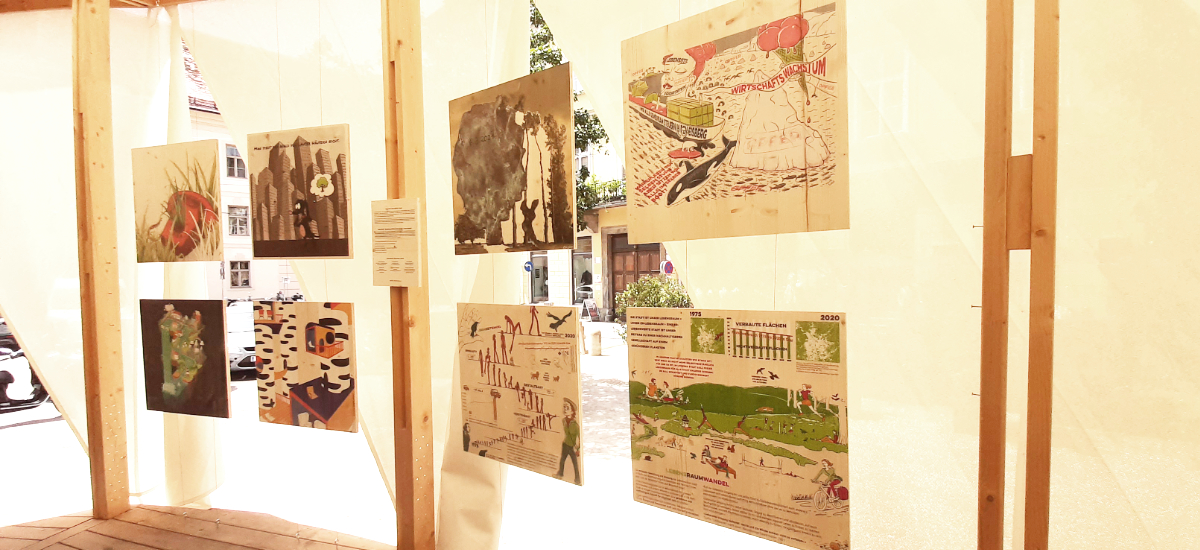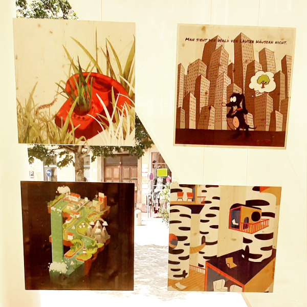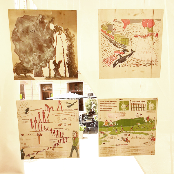 2. Etappe der Wander-Ausstellung Die zweite Etappe der Wander-Ausstellung trägt den Titel „Illustrierte Blickwinkel aus der Umbruchzeit“: Wir präsentieren illustrative Arbeiten welche unsere Sicht auf die die gegenwärtigen und zukünftigen Herausforderungen unserer Gesellschaft visualisieren. Die Themenschwerpunkte orientieren sich an den bespielten Orte oder Events. So wie die Zeit vergeht und unsere Ausstellung durch die Stadt wandert, entwickeln und wandeln sich unsere Anliegen, Botschaften und Ausdrucksmo?glichkeiten, reflektieren wir gesellschaftliche Fragestellungen und perso?nliche Emotionen, und stellen sie in illustrativer Form in der O?ffentlichkeit zur Diskussion. Im Rahmen des Lendwirbels Graz, präsentieren wir unsere Holzbilder, die schon im Klima-Kultur-Pavillon 2021 zusehen waren, als mobile Outdoor-Ausstellung auf einem Transportrad. Es handelt sich um Arbeiten zu den Themen Klimawandel, Stadtklima und Transformation.